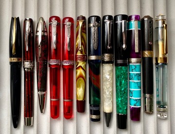 | 12 | Stipula Suprema Nuda clear “demonstrator” limited edition fountain pen, No. 337/351. Pen has a powerful piston-fill mechanism. Fills in a flash. This one has a monotone 14K 1.1 Italic nib. Excellent + condition……………………………………………………………………..…………………………$375 |