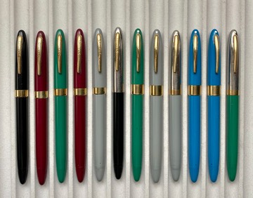 | Row F: Sheaffer Thin Model (TM) Snorkel: This is the pen that gave the Parker 51 a run for its money. For people who are just getting interested in vintage pens, it is an especially good pen to consider. Like so many other classic vintage fountain pens, Sheaffer’s Snorkel captured the best of what American pens had to offer during the fifties and sixties: quality, craftsmanship, classic looks, reliability, durability, and smooth performance. Though one often hears about how complicated the filling mechanism is, in truth, it’s not that complicated and it certainly isn’t complicated to fill and write with. The pen comes either with traditional open nibs or with Sheaffer’s famous conical Triumph nib. Nibs are either 14K gold or palladium-silver alloy. Do not dismiss the palladium-silver alloy nibs. They are expensive, high quality nibs made from an alloy of palladium and silver, and they are a far cry from more common stainless steel nibs. Pens were given new model names as they traveled up the Snorkel ladder progressing from alloy nibs to gold nibs, and progressing from caps and barrels made of plastic to caps and barrels made from more expensive materials including gold-fill and gold. White dot guarantees available for upscale pens also added cost. Snorkels that follow are in very nice condition: there is no significant wear to pocket clip or trim, including chromed metal barrel threads or pen bodies. No fissures or fractures where the pocket clip is attached to a plastic cap. No chewed up end caps. No names or initials on caps or barrels. There may be light surface scratches on metal caps suggesting light use. If there is a ding or a flaw, I will do my best to point it out. If I say very nice throughout, please refer to what I have said above. | |