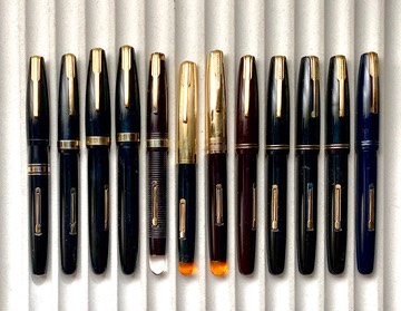 | Row A: One-Hundred Year, Commandos, and Taperite. Some with Special Nib. All pens in this row are lever-fill pens. Screw cap on all except Taperites, which are slip caps. | |