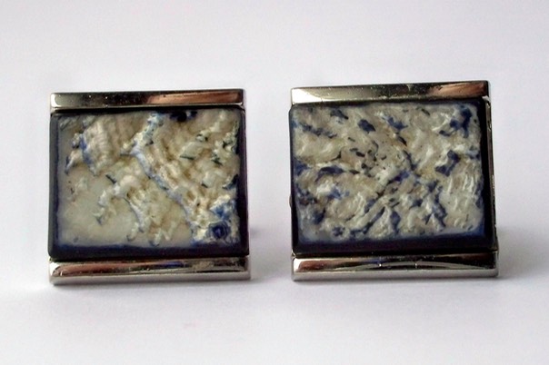 3241 c. 1960s Dante silver tone square cufflink with ‘rough’ texture resin center marble white with rich blue veining popping out. Medium size, approx. ¾” x ¾”, very nice. Price: $35