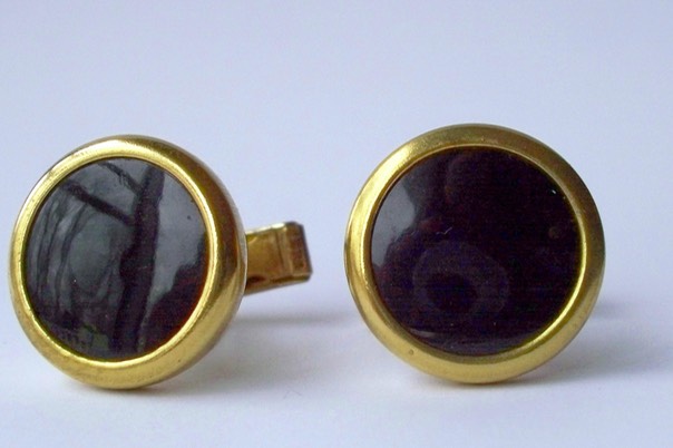 3243 c. 1940s Broadway Tuxmakers gold tone setting with black center. Small size, roughly 5/8” diameter. Price: $10