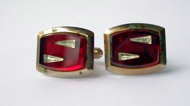 3245 c. 1940s Barrel shaped setting with red Lucite and white diamond shaped faceted inserts. Some wear to bezel, but these are just plain funky and scream 1940s! I had to include them! No maker’s mark. Medium size, approx. ¾” x ½". Price: $20