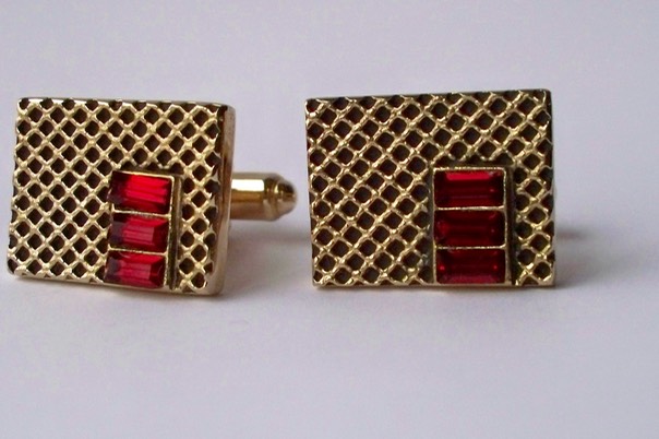 3250 c. 1940s Honeycomb texture gold tone cufflinks with three faux faceted rubies. Very nice condition. No maker’s mark. Medium size, approx. ¾” x ½”. Price: $25