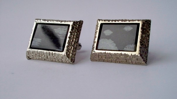 3257 c. 1960s Destino ‘snow flake’ obsidian large rectangular cufflinks with fancy beveled silver tone border. Really nice! Size: 1” x 5/8” Price: $45