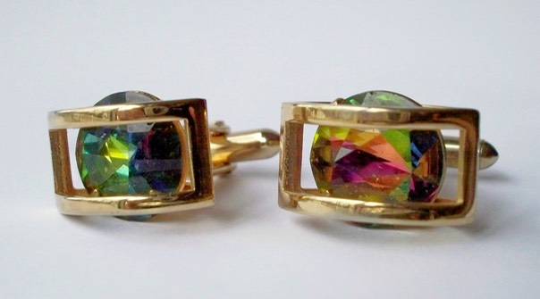 3262 c. 1970s Swank highly stylized pronged and faceted ‘watermelon’ crystal within a gold tone cage. Funky and a bit unusual, but very pretty! ¾” x ½” Price: $35