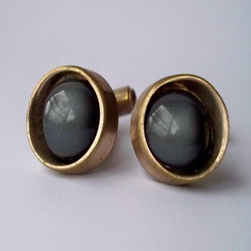 3265 c. 1950s Moderne (ovoid) gold tone cufflinks with recessed gray stones- remind me of the deadly death ray device used by aliens in a cheesy B movie ‘The Mysterians’ back in the late 50s. Signs of normal wear present, but frankly- too funky not to list! No maker’s mark. Size: approx. ¾” x ½”. Price: $25