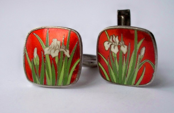 3280 c. 1940s enameled ‘Iris’ cufflinks marked ‘silver’ on back. No maker’s mark. Small/Medium size: approx. ¾”- more T.V. shaped (rounded) than square. Price: $45