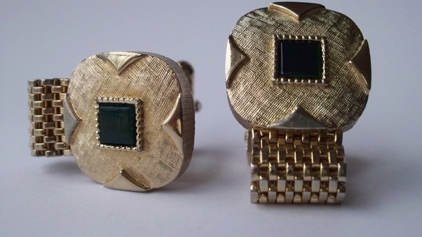 3283 c.1960s Swank wrap around cufflinks, gold tone finish. Polished and textured face with green inserts. Super shape. Medium size: face measures about ¾” x ¾”. Price: $25