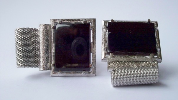 3284 c. 1960s Dante fine mesh wrap silver tone cufflinks with large glossy black inserts in pronged setting (may be onyx but can’t say for sure). These are large and lovely and in very nice shape. Face measures approx. 1’ x ¾”. Price: $45