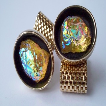3288 c. 1970s oval wrap cufflinks with ‘mystery’ stone at center takes on pink, purple, and yellow iridescence. These are next generation to ‘The Mysterian’ cufflinks above. Cufflink face approx. 1” x ¾”. These are crazy and in very nice shape! Price: $45