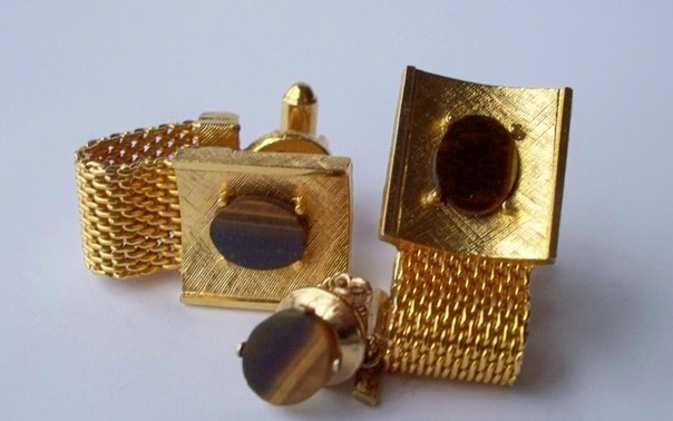 3292 c. 1960s Dante gold tone mesh wrap cufflinks. Oval tiger eye set against textured Florentine style concave background, polished edges. Lovely! Like new w/ matching tie tack. Medium size: roughly ¾” square. Price: $35