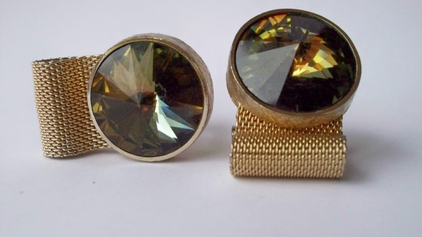 3293 c. 1960s Dante gold tone mesh wrap cufflinks. Large Rivoli watermelon faceted crystal takes up most of face. Textured border, Large ¾” diameter. Like new. Price $65