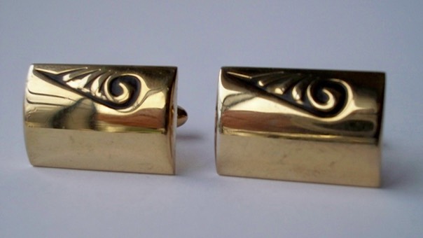 3303 c. 1960s Swank rectangular gold tone cufflinks with fancy scroll on face. Small/Medium size, approx. 1’2” x 1”. Price $15