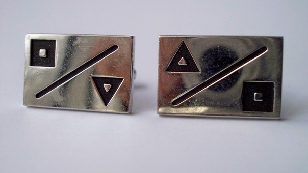 3305 c. 1950s Geometric silver tone rectangular cufflinks. Polished surface shows slight wear but very wearable. No maker’s mark. Medium size 5/8” x 7/8”. Price: $15