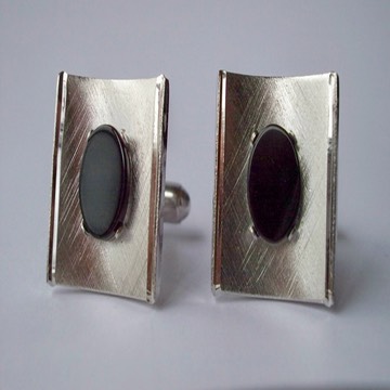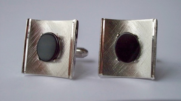 3313 c. 1960s Dante concave cufflinks oval onyx center. Textured background /polished edges. Elegantly understated and like new. Size, Medium, c. ¾” x ¾”. Price: $35