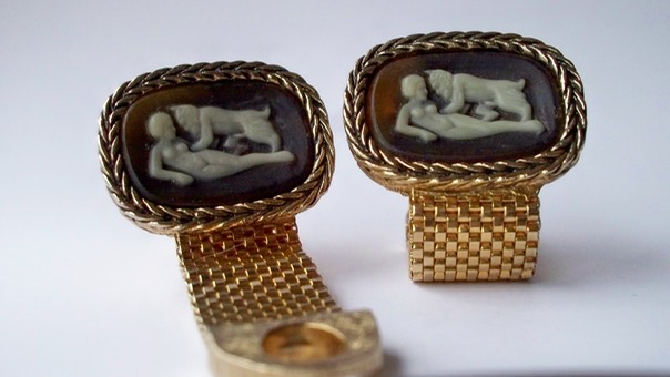 3314 c. 1960s amorous satyr gold tone wrap cufflinks. Faux cameo, white against a brown background. Mint. Large, approx. 11/4” x ¾”. Price: $35
