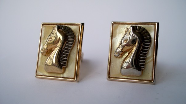 3348 c. 1950s Swank horse head cufflinks against celluloid background. Small/Medium size, c. ¾” x 5/8”. Show some use. Price: $15
