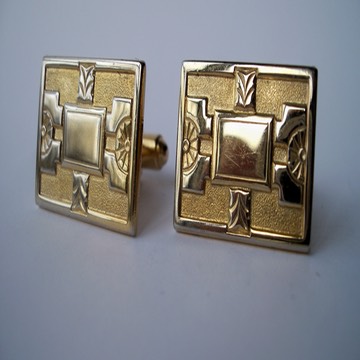 3353 c. 1950s Anson rectangular gold tone cufflinks w/ raised polished center against textured background. Reflection makes cufflinks appear worn. They aren’t. Classier in person than what picture shows. Medium size, c. 1” x 5/8” very nice shape. Price: $20
