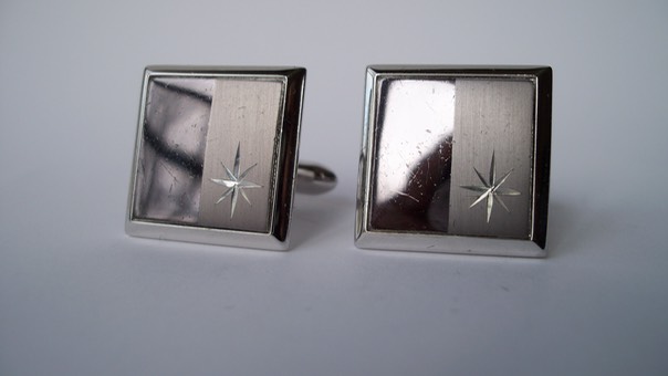 3356 c. 1960s Swank brushed/polished silver tone square cufflinks. Believe me, these are much better in person. I put them at an angle to show small scratches from use- barely visible. Medium size, c. ¾” square and very nice. Price: $15