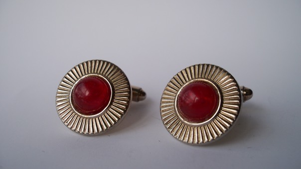 3360 c. 1940s round gold tone cufflinks with red cabochon center. These are much more polished than picture suggests and in nice shape with some evidence of use. Nice vintage look. No maker’s mark. Medium size, c. ¾” diameter. Price: $15