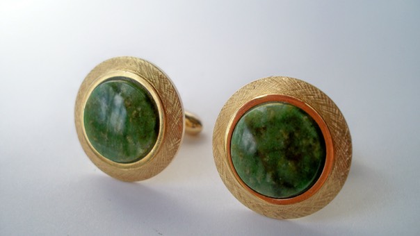 3395 c. 1960s LaMode round gold tone ‘karatklad’ cufflinks with polished green stone center and beautiful Florentine bezel. These are gorgeous and in super shape! Size: Medium/Large, about 7/8” in diameter. Price: $40