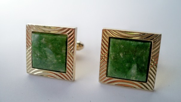 3404 c. 1960s Dante square cufflinks, jade center with patterned gold tone border. Links have far more luster than picture suggests. These are really nice. Slight wear noted on face. Size, Large. c. 7/8” square. Price: $35