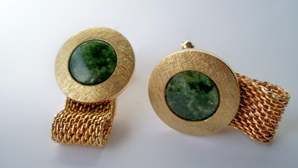 3411 c. 1960s Destino wrap jade and gold tone cufflinks. Beautiful Florentine border. Like new. Mediums size, face is c. 7/8” diameter. Price: $35