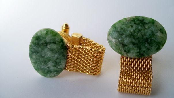 3414 c. 1960s Dante wrap oval jade (or jasper?) and gold tone cufflinks. Like new and very beautiful. Stones without borders. Medium size face 1’ x ¾”. Price: $45
