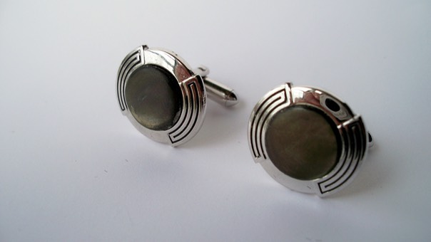 3418 c. 1950s Swank silver tone cufflinks with abalone center and contemporary style border. Small/Medium c. ¾” diameter. Show light wear. Price: $15