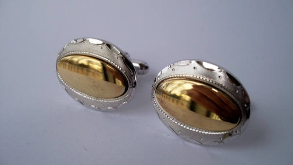 3442 c. 1950s Anson weighty sterling silver oval cufflinks. Gold tone center against matt background and polished scalloped edges. These are beautiful and like new. Medium size: c. 1” x ¾”. Price: $45