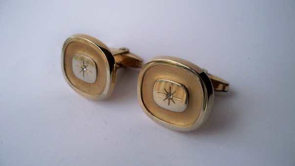 3455 c. 1960s Foster gold tone cufflinks. Polished center and border. Satin finish in between. Beautiful and subtle- nicer than picture suggests. Size: c. ¾”x3/4” Price: $20