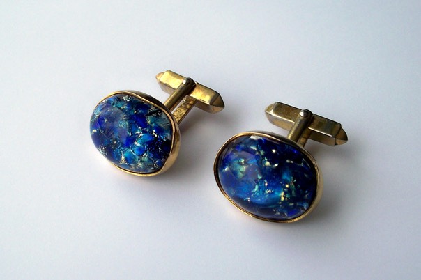 4336 c. 1940s brilliant multi-hue blue/purple cabochon oval cufflinks in gold tone setting; elbow style posts; Medium size, approx. ¾”x1/2” no maker’s mark; Price: $25