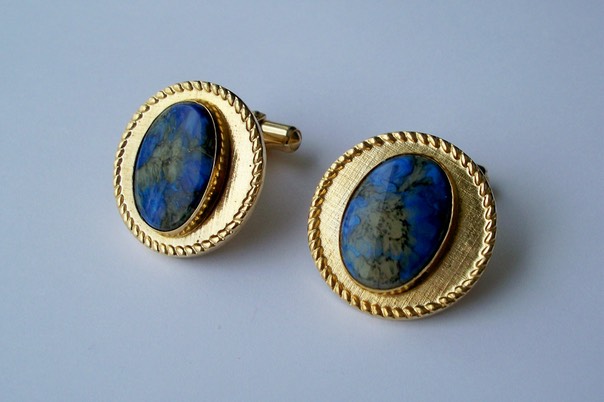 4361 c. 1960s Destino round gold tone cufflinks w/ oval blue multi-hued stone at center, textured background and rope border. Large, c. 1” diameter; like new; Price: $35