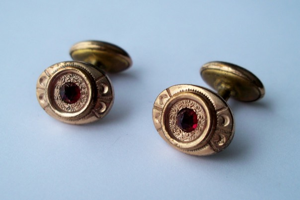 4381 c. 1920s gold tone repousse cufflinks with faceted garnet (I think) centers. Very pretty and unusual. Small size; Price: $35