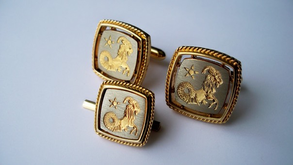 4395 c. 1960s gold tone Zodiac cufflinks and tie clip about ¾” square. Price: $25