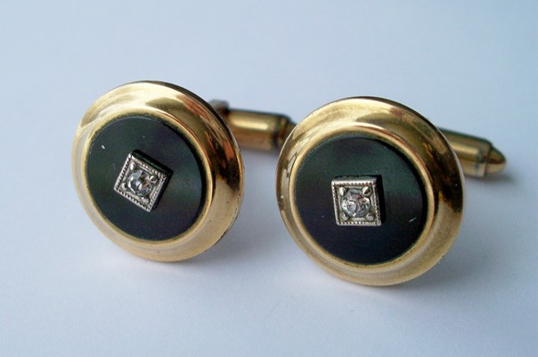 4398 c. 1940s Krementz round gold tone cufflinks with onyx and faceted stone center.