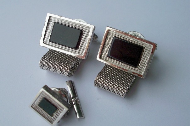 4425 c. 1960s Dante rectangular silver tone wrap cufflinks. Medium size: face measures ¾”x1/2”. Black center stone likely onyx. Comes w matching tie tack. Price: $30