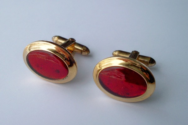 4428 c. 1950s Correct Quality gold tone oval cufflinks with translucent red center. Beautiful with beveled border. Medium size, c. 7/8”x5/8”. Super shape. Price: $25