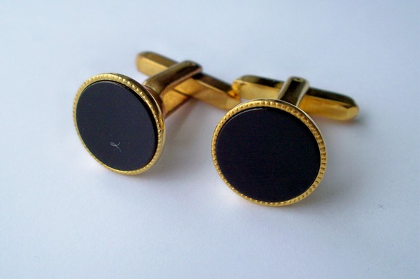 4433 c. 1940s Hickock round dished cufflinks w fancy border. Center stone looks like onyx. Small size. Price: $25