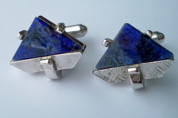 4448 c. 1960s Destino (later mark) triangular silver tone cufflinks- blue stone (likely lapis). Textured silvertone setting. We’ll call them Medium size. Unusual. Price: $35
