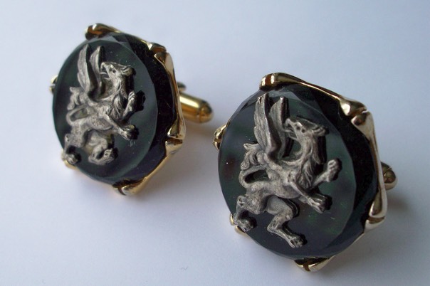 4497 c. 1960s Shield’s striking griffin cufflinks in high relief against black background. Griffin looks to be pewter like material. Hexagonal pronged setting. Large- over an inch in diameter. Price: $30