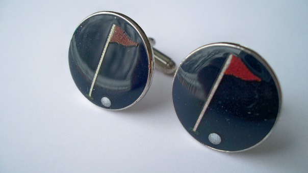4556 c. 1960s golf cufflinks- ball and flag against black background. Medium size, c. ¾” diameter. No maker’s mark. Lovely condition. Price: $25