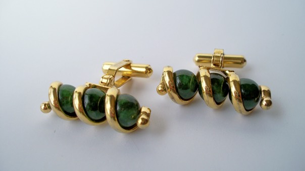 3389 c. 1960s Destino unusual long, spiral gold tone cuff link containing three jade balls. M/L size: 11/8” x 3/8” Outstanding! Price: $65