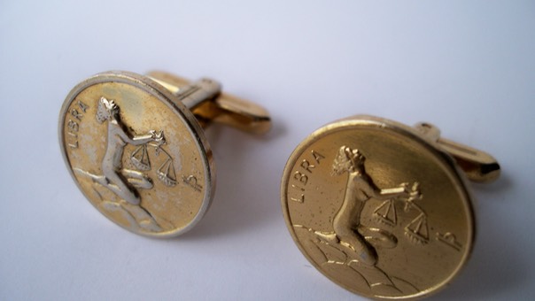 3365 c. 1970s Hickok Libra gold tone cufflinks. Lucky day, number on reverse side. Wear to one link more than other- see photo. S/M- approx. ¾” diam. Price: $20