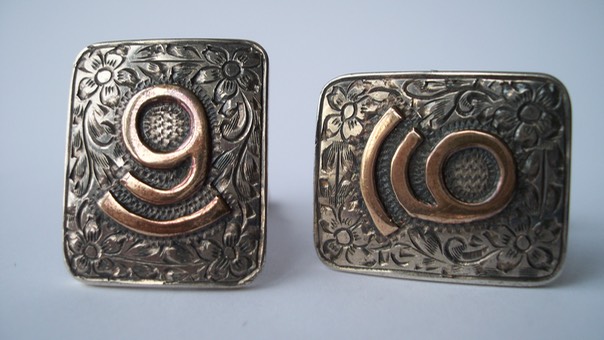 3369 c. 1950s rectangular hand engraved Mexican sterling silver cuff links with applied (possibly gold) numerals. M/L size: approx. 5/8”x3/4” Price: $75