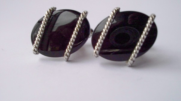 3281 c. 1960s Dante oval cufflinks. Stone appears to be onyx with silver tone rope braid over front. Small/Medium. Approximately ¾” x ½”. Beautiful! Price: $35
