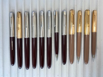 51 Demi pen and pencil set in buckskin. Fine 14k nib. Very clean set, not quite up to the condition of the set just to the left of it. Still, nice clean set with no dings to the caps. …….$145 |