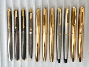 Parker 61 Insignia (Signet) in gold-fill metal. There are two of these pens and they are both in excellent plus condition. Slight surface scratches. Teflon-coated filling unit has darkened so it must have been used. No scratches on the nosecone, no evidence of a ring on the barrel where the cap posts, etc. Both are exceptional pens. Both write with a Fine to Medium line. Again, no filling unit guarantees with this pen. Choice...............................,,,,,,,,,,,,,,,,,,,,,,,,,,,,,............................................................$225 each. |