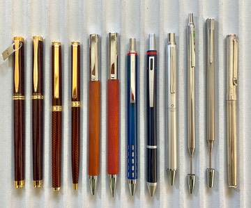Faber-Castel Ambition ballpoint pear wood and chrome-plated trim. There is a color difference between the ballpoint and the pencil next to it. These are nice writing instruments with a bit of heft to them. Near mint…………………………………………………………………………….$40 |