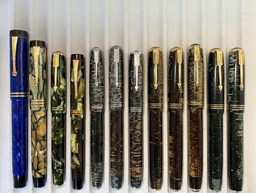 Duofold De Luxe Streamline Senior in Moderne pearl and black , c. 1930. Button filler. Excellent condition throughout. Difficult to find with such good color. Slight to moderate (at best) discoloration of the barrel. Excellent trim, threads, and barrel imprints. Slight surface scratches on casing indicating light use. Tiny bit of brassing on ball of pocket clip. Big Duofold DeLuxe nib looks to be Extra Fine……..$475 |